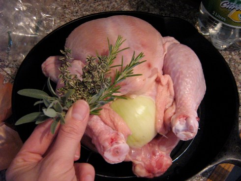 Remove neck and giblets from the cavity of the chicken (if they are in there!). Peel the onion and cut in quarters. Stuff in cavity along with fresh springs of rosemary, thyme, and sage.