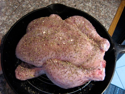 Place the chicken on a rack in a roasting pan (I recommend a large cast iron frying pan with a circular rack). Pat the skin of the chicken dry with paper towels and rub with olive oil. Sprinkle liberally with salt and pepper, garlic powder, and dried herbs.