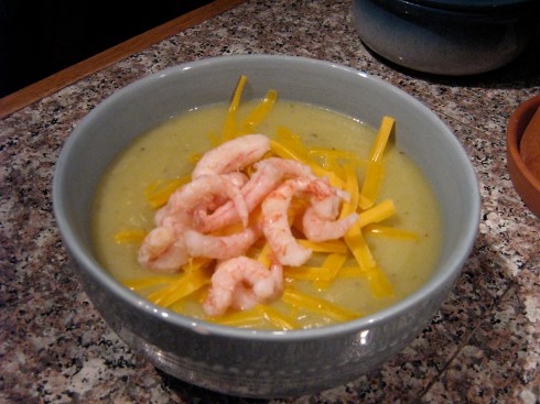 This recipe originally comes from a friend of my Mum. It’s one of my favorite comfort foods: simple, delicious, satisfying. It is good enough plain, but what makes it extra good is stirring toppings into your bowl of soup. I really like adding shredded cheese and hand-peeled shrimp. Crumbled bacon is also really good.