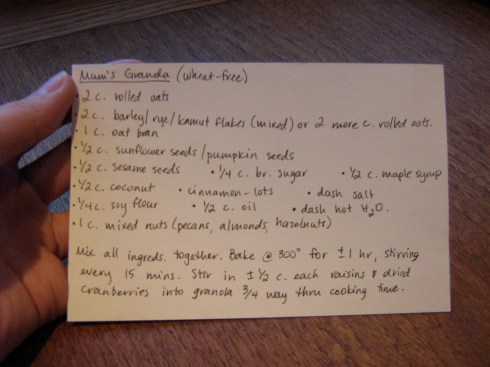My Mum has made homemade granola for almost as long as I can remember. When I was a kid I wasn’t a big fan – too grainy, too healthy – but in recent years I have come to appreciate just how delicious is it. My favorite part is the slightly sweet, toasted pecans, and Mum used to tell me off for picking them out of the freshly made granola cooling on the counter. Ahh, memories 😉 Anyway, I’ve had this recipe in my recipe box for a while now, but I only got around to making it for the first time this past weekend.