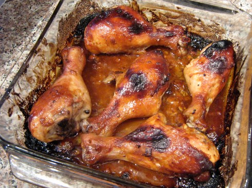 My friend Cara makes delicious honey garlic pork spareribs, and I love how the honey and garlic caramelize in the sauce and get all sweet and sticky (or rather, even more sweet and sticky!) in the oven. This chicken dish sort of mimics that sparerib sauce, with the addition of Dijon mustard. I used skin-on chicken legs here, but it works equally well with chicken thighs, and the chicken pieces can be skin-on or off. The measurements are all “more or less”, so taste it before you add the chicken and adjust as you see fit. Use a baking dish that accommodates the chicken fairly snugly (it will shrink as it bakes), so that the sauce doesn’t dry out in the oven and the chicken stays moist. Serve with rice or some other grain to soak up the delicious sauce!