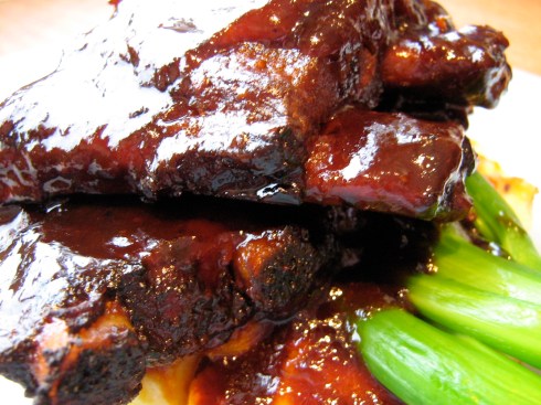 Mix together sauce ingredients in a slow cooker insert. Add pork ribs and turn to coat. Cover and cook on low for 6-8 hours, until tender and saucey. Alternately, bake in an oven-proof dish with a lid (or covered in foil) at 200˚ F for about 4 hours, or at 300˚ F for about 2 hours. Serve over mashed potatoes with the sauce spooned over the top. Serves 2-3.
