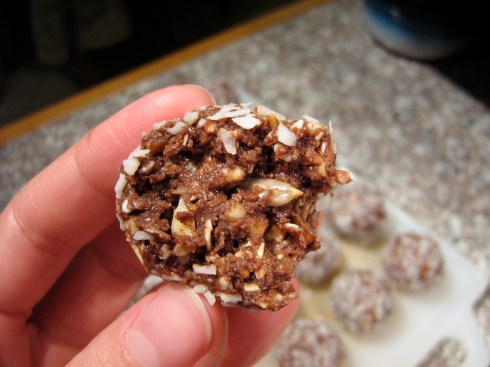 Form into ping-pong ball-sized spheres and roll in more shredded coconut. Store in an airtight container, layered between waxed paper, in the fridge. Makes about 21.