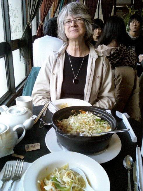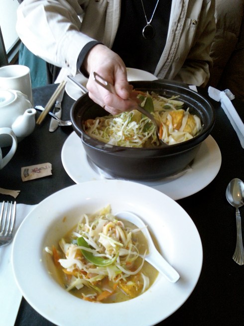 All of the menu items sounded tasty, and the restaurant itself smelled amazing. The blurb at the top of the menu stated that the food was cooked according to Ayurvedic principles, resulting in a harmonious and balanced taste. I don’t know anything about Ayurvedic cooking, but I can tell you that that food we had was delicious – definitely harmonious and balanced! Mum and I shared a large order of the Bangkok Floating Market Seafood Pot, which came to our table in a big cast iron vessel full of fragrant broth, salmon, prawns, calamari, simmered vegetables, and rice noodles, topped with thinly sliced cabbage, green onions, bean sprouts, and crispy onion. It was SO GOOD. The broth was INCREDIBLY flavourful with coconut milk, lemongrass, ginger, chili, fish sauce, and kaffir lime leaves (which I don’t think I had ever tasted before, and are very neat-looking with their double leaves). The seafood was perfectly cooked, fresh and delicious, and the crunchy sweetness of the raw cabbage on top of the savoury broth and slurpy rice noodles was a great combination. It seemed to be a very popular choice – almost every other table had ordered it too!