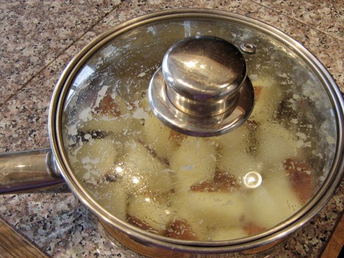 Bring to a boil (covered) in salted water over high heat. Turn down to medium heat and boil for 2 minutes. Immediately drain potatoes (keep them in the pot), replace the lid, and shake the pot vigorously back and forth 4 or 5 times (hold the lid on with oven mitts or a cloth!).