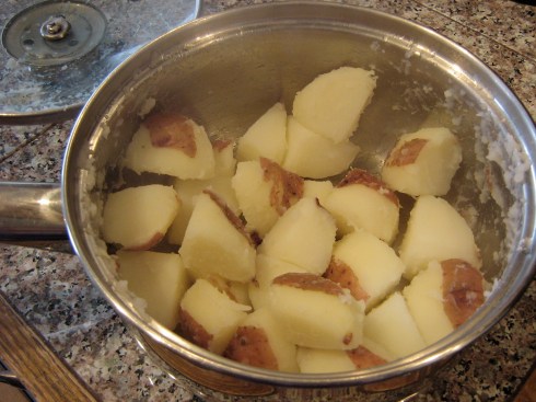 3-4 medium sized potatoes, peeled or unpeeled, cut into bite-sized pieces (I used red potatoes and peeled them in stripes so that there was still some skin for texture and colour)