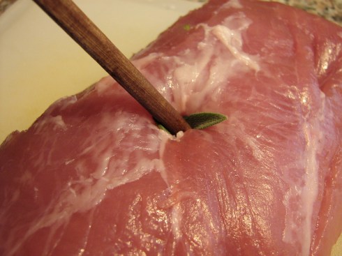 Poke holes in the tenderloin with a knife and use the tip of a chopstick (or your finger) to poke a sage leaf into each hole – probably about 24 holes over both side of the tenderloin.