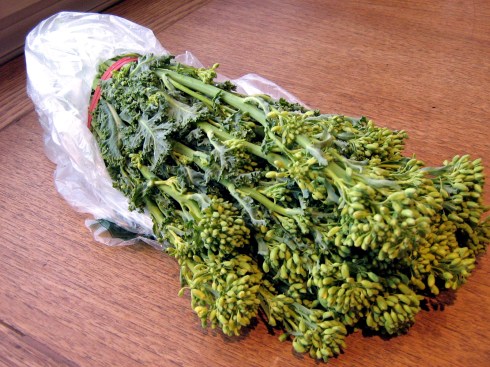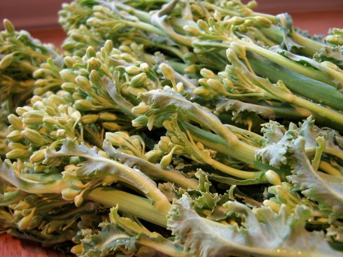 Anyway. The other day I was at The Root Cellar, browsing for dinner ideas, and I saw these kale tops. I am a big fan of brassicas (the broccoli family – my Dad calls them broccolids) so I was intrigued. Essentially, this is kale that is going to seed and is just about to burst into flower – probably not something that most people would think to eat, and definitely the first time I’ve ever seen it in a store – but why not? They looked so beautiful, green and crisp and fresh… so I brought some home to try.