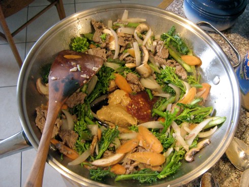 Mix this all together in the center of the pan, adding a few spoonfuls of water if needed to get it combined. Return the pan to the heat, get the sauce bubbling, and toss everything around until evenly covered. Serve over rice or noodles (my current favorite base is quinoa or brown rice).