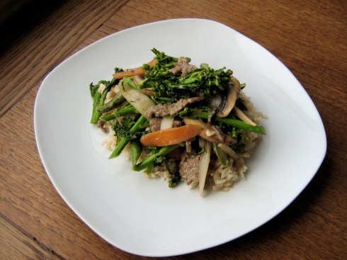 Have all your vegetables and meat (or other protein) cut up and ready to go. I usually use at least half an onion, a few cloves of chopped garlic, and some grated ginger for the aromatics. (Here’s a tip: keep the ginger in the freezer, then grate it on a microplane grater – fresh ginger on demand, and keeps it from getting all shriveled up in the fridge!) For vegetables, I try to keep it simple: 3-4 different kinds, preferably in a rainbow of colours. One of my favorite meats to use in a stir fry is pork, sliced thin against the grain, although this time I used flank steak, which is great for stir fries.
