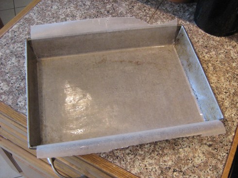Spray or grease a 9″ x 12″ baking pan, then line with waxed paper and spray/grease the paper.