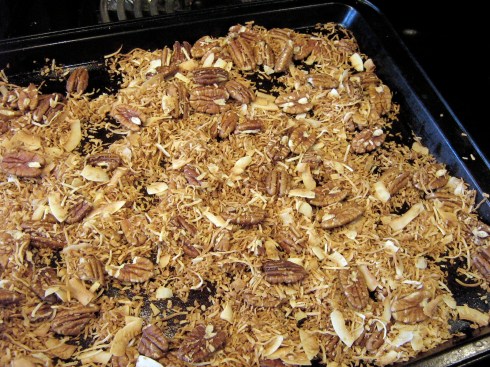 Place in the oven and toast until golden brown and fragrant, stirring a few times (about 10-15 minutes). (Martha recommends keeping the coconut and pecans separate on the baking sheet, but I’m not sure of the reason for this. Mixing them together seems to work just fine!)