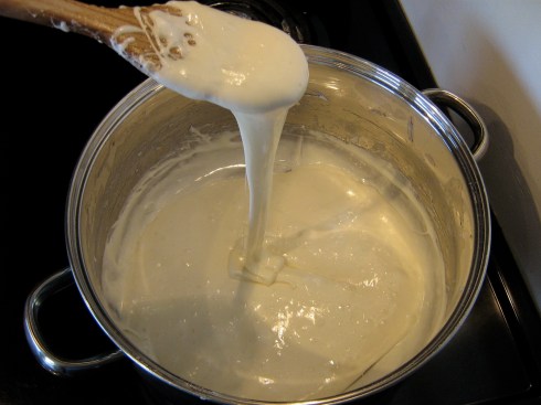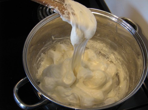 Heat and stir until the marshmallows are melted and smooth – this will take a while and they will go through different stages of weird/gloopy/lumpy until they are finally melted. Don’t be tempted to turn up the heat – you just want to melt them, not cook them, otherwise the marshmallows will get too hot and harden before you can mix in the rest of the ingredients.