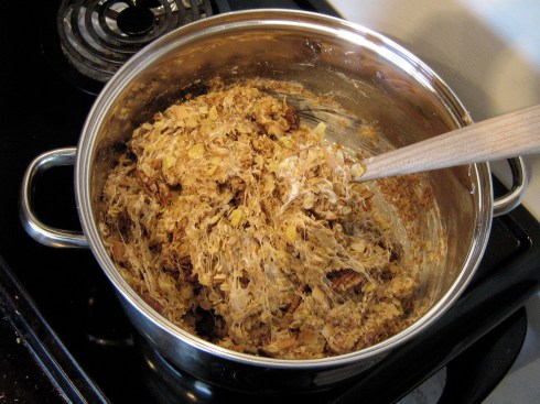 Remove from the heat. Stir in a splash of vanilla, then stir in the toasted coconut and pecans and 4 cups Just Right cereal (or your favorite cereal flakes). It might seem like there is not enough marshmallow to incorporate everything, but just put some muscle into it and you’ll be fine.