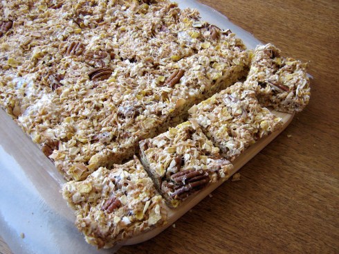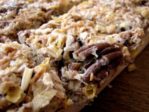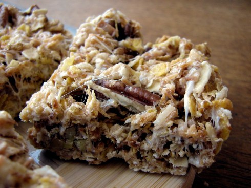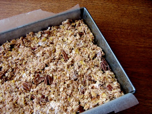 I was looking through my baking cupboard yesterday and realized I had all of the necessary ingredients for these bars on hand: leftovers from a massive bag of marshmallows from a class camping trip, shredded coconut from making granola, pecans, and cereal. This morning when I actually pulled everything out and started to measure, however, I discovered that I didn’t have quite enough of anything. *Sigh*. By that point I was committed to making them, so half an hour and one trip to the store later, I *actually* had all of the necessary ingredients on hand and in the right amounts!