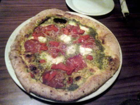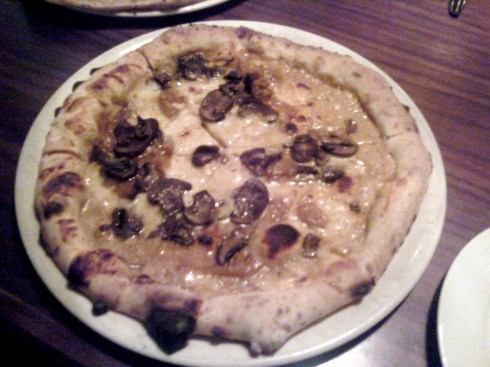 I almost didn’t post about this Second Saturday outing, because the pictures I took are so awful (crappy cell phone camera + dark restaurant = baaaaaaad photos), but the pizza was so good that I can’t not share. So here it is. Please excuse the photos!