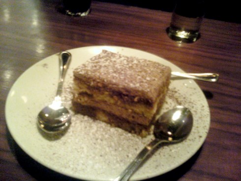 The three pizzas were more than enough to feed us, but somehow Katheryn and I found room to order dessert. There were a few choices, including gelatos and sorbettos, but for us it was tiramisu, no contest. On a previous visit I had a hazelnut tiramisu that was the single most delicious tiramisu I’ve ever tasted (I plan on trying to recreate it at home sometime), so my hopes were high. Sadly, this one didn’t quite measure up: it wasn’t terrible by any means, but it was no sublime hazelnut tiramisu. In my experience, tiramisu is often either too soggy or too dry, and this one was a little on the dry side. However, based on the overall quality of the food, I wouldn’t hesitate to order it (or anything else on the menu) again.
