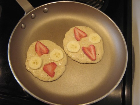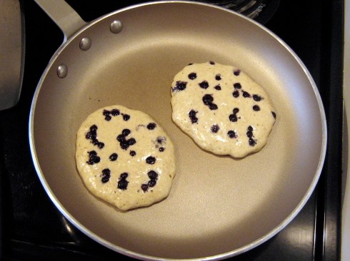 Add wet to dry and mix with a whisk until just combined. Let rest while the pan heats up over medium heat – for best results, use a non-stick, heavy bottomed pan. Grease the pan with a little bit of butter and drop about 1/4 – 1/3 cup of batter per pancake into the pan. It you want, top each pancake with the fruit if your choice (bananas, fresh or frozen berries, etc – if you are using frozen fruit that is larger than a blueberry (ie, a sliced frozen strawberry), you may want to cook the pancakes a little bit longer, as the batter under the frozen fruit might be a bit runny otherwise).