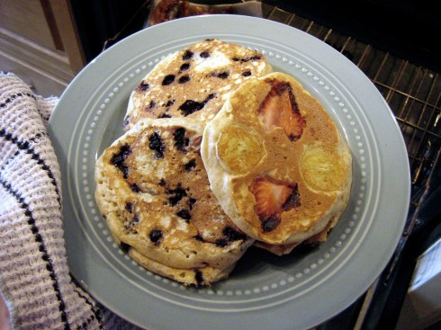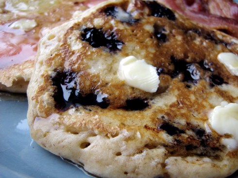 I am constantly on the search for the “best” or “perfect” recipe for certain things – among them, pancakes, pie crust, and chocolate chip cookies. My go-to pancake recipe has been one that I got from TV quite a few years ago, and it has never failed me… however it calls for buttermilk, which is not something I usually have hanging out in my fridge, especially on random weekend mornings when the pancake urge hits. I end up making sour milk with a dash of white vinegar and subbing it for the buttermilk, but the fact that the recipe contains an inconvenient ingredient sort of subtracts from the “perfectness” of the recipe for me (yeah, I’m a weirdo). (Also, I’ve never really understood what makes a buttermilk pancake any better than a regular pancake, so I’ve never really seen the need to use buttermilk.) Anyway, the quest continued…
