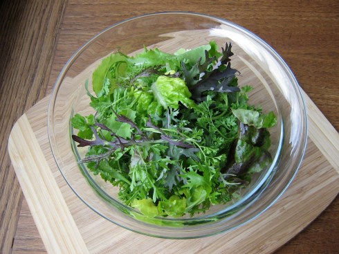 I spent the weekend on Salt Spring Island for my 10 year high school reunion (I cannot believe it has been 10 years – I don’t feel old enough for that yet!). It was a really great weekend, full of sunshine, old friends, and good food – including some of the Salt Spring classics: dough boys covered in cinnamon-sugar at the Saturday Market, pesto-cheese twists from Barb’s Buns (now apparently Barb’s Bakery and Bistro), and the tuna melt at the Tree House Cafe. I have to admit though, one of my favorite things about going to Salt Spring is eating vegetables out of my Mum’s garden. She is an avid gardener and has a huge garden that produces all kinds of delicious things, including these salad greens, which traveled back to Victoria with me: