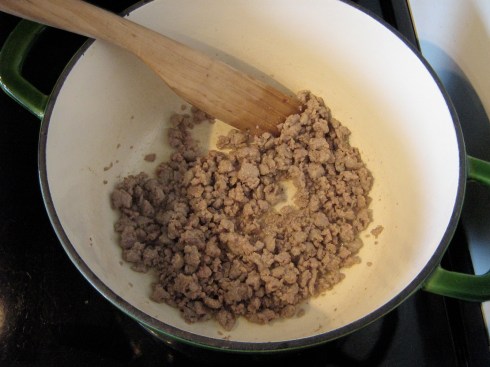 Remove the casings from 4-6 links of Italian sausage (hot or mild, your choice) and brown them in 1 tbsp olive oil in a large, heavy pot over medium-high heat (if the sausages release a lot of liquid, turn up the heat until the liquid evaporates and just the fat remains). When the sausage is cooked, remove it from the pot and set aside, reserving about 1 tbsp of fat in the pot.