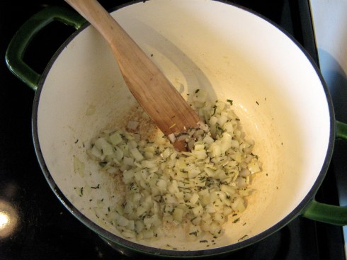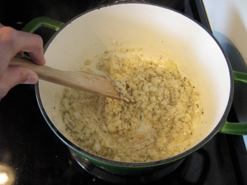 Return the pot to medium heat and add 1 tbsp of butter. Sauté the onions until the edges are opaque, then add the garlic and sage and cook until the onions and garlic soften.