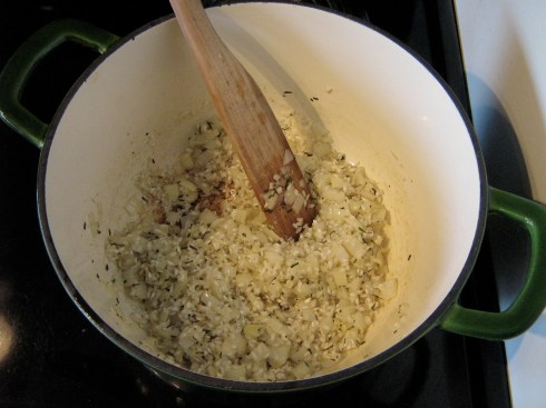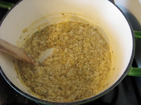 Add a ladle full of simmering pumpkin-stock (or 1/2 cup of white wine, if you have it – I never seem to!) to the rice and stir to loosen the browned bits on the bottom of the pot.