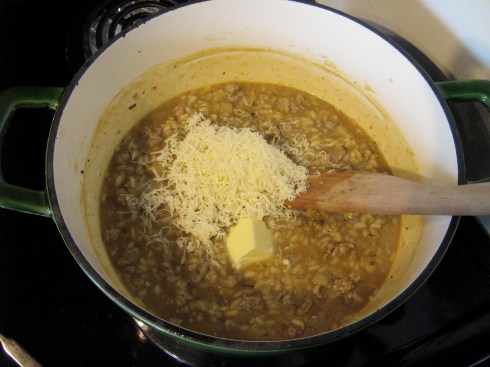 Continue stirring and adding ladles of stock until the rice is al dente – at least 30 minutes (if you are running out of stock, add some boiling water to the stock pot). The grains of rice should be suspended in a sauce the consistency of heavy cream (it will continue to thicken off the heat).