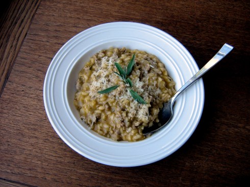 Do you remember the days before the Food Network? Before Diners, Drive-ins and Dives and Top Chef and Cupcake Wars and Giada Di-Whatshername and Iron Chef, when channels like the Knowledge Network and KCTS9 aired cooking shows of the same calibre as Bob Ross’ The Joy of Painting? I loved those shows. I used to sit in front of the TV, watching, with a pen and paper to write down the recipe and ingredients because there was no internet to get it from after the show. This risotto is based on a recipe from a show called Nick Stellino’s Family Kitchen, and believe it or not, the original recipe is now available on the internet!