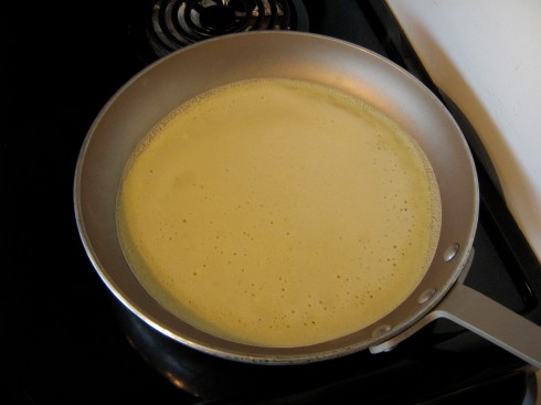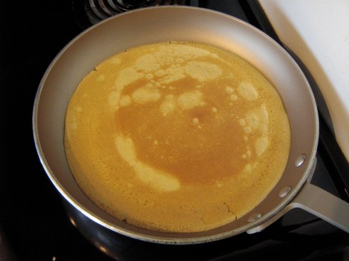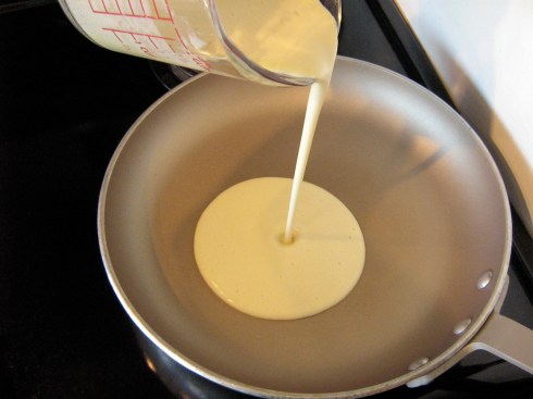 Swirl the pan to spread out the batter evenly. It will be ready to flip when the top is dry and the edges start to come away from the pan.