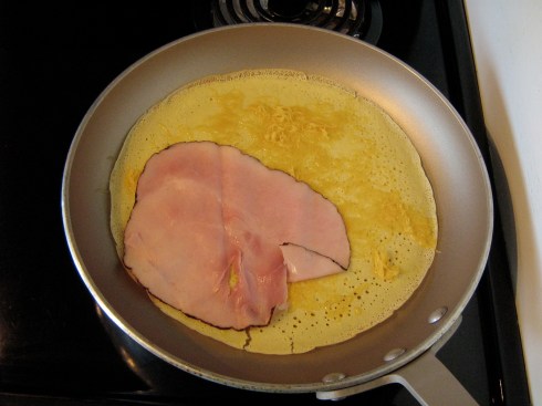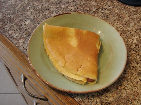 For ham and cheese filling: Flip the crepe back over so it’s right side up in the pan. Sprinkle with finely grated cheese and place a slice of ham over half the crepe.