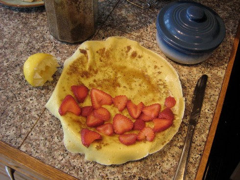 For butter/brown sugar/strawberry filling: Remove the crepe from the pan and place on a plate. Spread with butter, a spoonful of brown sugar, and a squeeze of lemon juice. Place sliced strawberries over half the crepe.