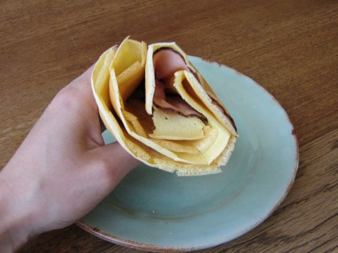 Anyway, there was no real recipe, it was just more a matter of mixing together an egg, some milk, and some flour until the batter was the right consistency, and then cooking them in a hot, non-stick pan (the non-stick part is important!). These “leathery pancakes” were one of the things I made for myself all the time when I was younger – I’d usually eat them with butter and maple syrup, and sometimes I’d roll them around some kind of savoury filling. At the crepe place in Vancouver, the crepes were spread with whatever filling you wanted, sweet or savoury, and served folded in quarters. I had one with ham, cheese, and egg, plus a Nutella one for dessert (I’m totally OK with having dessert at breakfast!). Unfortunately, I don’t have any Nutella in the house, so I had to make do with butter, brown sugar, lemon juice, and strawberries for a sweet filling, and ham and cheese for savoury. Really good, and really easy. This amount of batter makes just enough for two 12-inch crepes – enough for one person if you’re hungry, or two people if you feel like sharing 😉