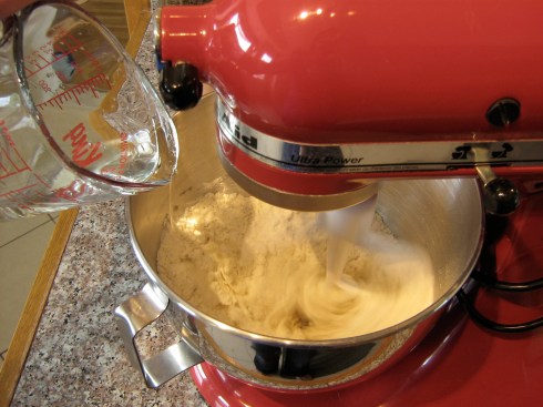 Pour the water mixture slowly into the flour, still mixing on low speed.