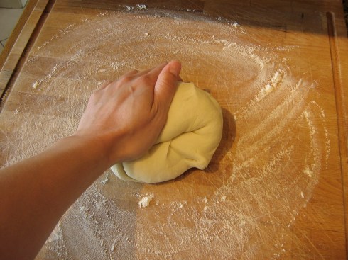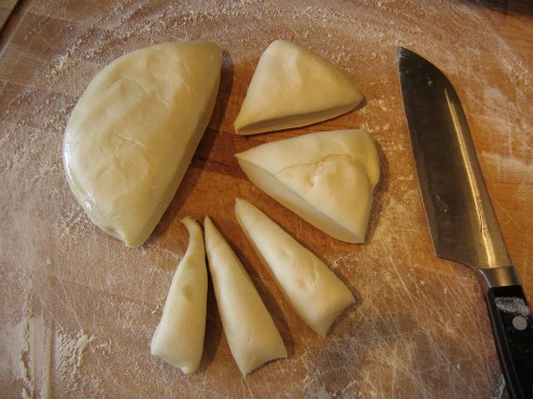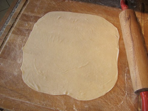 Flatten a ball out with your fingers and place on a well-floured surface. Roll out with a floured rolling pin or dowel until it’s about 9″x5″ (mine was twice as large), picking up the dough and re-flouring the surface underneath it every few strokes. Don’t be afraid of adding too much flour – keeping everything properly floured will make it much easier to roll, because if stuff starts to stick you’re in trouble! Let the dough rest for a minute or two if it starts getting difficult to roll out.