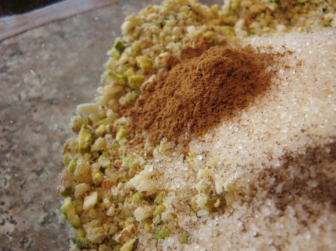 I also wanted to do a more “traditional” one (based on the conversations in the Daring Bakers’ forums, there are many different traditional versions of baklava!), so I followed the suggested recipe and used walnuts, pistachios, and almonds.
