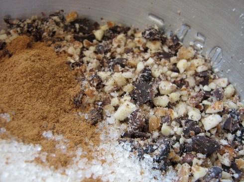 (Process each kind of nut separately to keep the pecans from being pulverized before the almonds are chopped.)