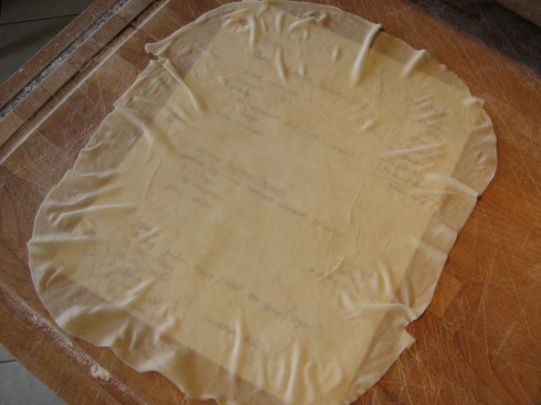 - The longer you let the dough rest before rolling, the better. At least 2 hours, probably more. I let mine rest for 2 hours, and I noticed that the dough was easier to roll towards the end (ie, 3 hours after I started) – probably a combination of longer resting time and improved rolling/stretching technique.