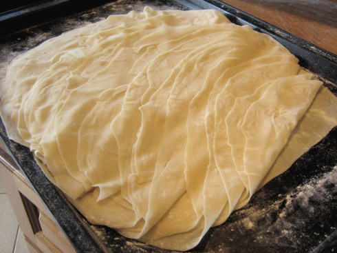 When the dough is stretched thin enough to read through, place it on a floured baking sheet, and lightly sprinkle flour between each sheet to stop them from sticking together. The original recipe says that the sheets won’t dry out, but it took me forever to roll them out so I covered them lightly in plastic, just in case.