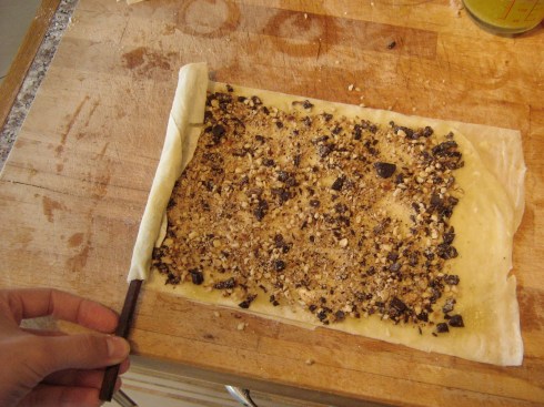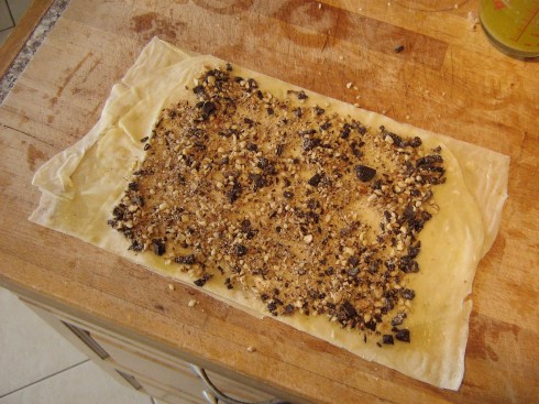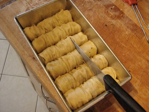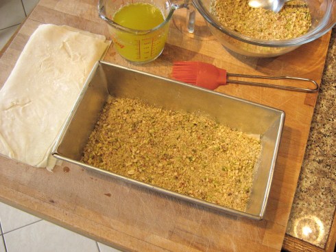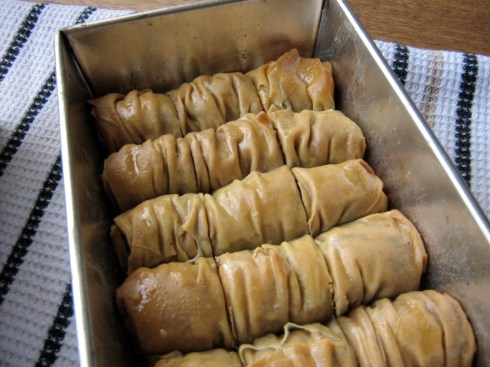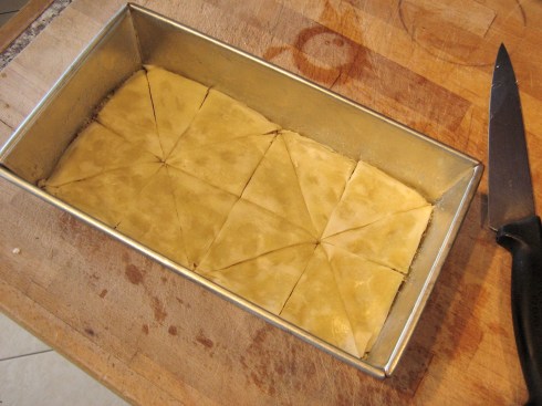 Cut the phyllo sheets so that the short edge is a few inches wider than the pan – do this a couple sheets at a time with a very sharp knife so that the edges of the phyllo don’t stick together. Don’t worry about saving a perfect sheet for the top – the outside of the rolls will be crinkly and any holes or tears in the phyllo won’t show.