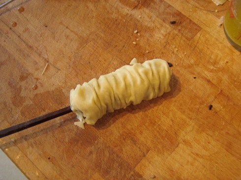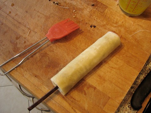 Place a chopstick (or wooden spoon handle, dowel, knitting needle*…) at one end of the phyllo and begin to roll it up loosely, lightly buttering the outside of the roll as you go.