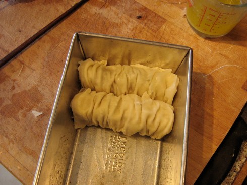 I made a 9″x5″ pan of each kind – turns out that one pan would have been plenty! And after spending 3 HOURS rolling out enough dough for two half batches, it was definitely enough!! This was a fun challenge though, and making something like homemade phyllo is exactly why I joined the Daring Bakers – but be warned: it is very time-consuming! I’m pretty strong and I’m actually quite handy with a rolling pin, so it wasn’t a question of me being wussy or too weak to roll out the dough. The rolling plus the stretching just took forever! And now my hands feel bruised and I won’t need to do any push-ups for a week…