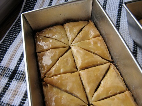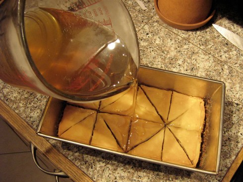 While the baklava bakes, prepare the syrup and allow it to cool (it’s OK if it’s still a bit warm). When the hot baklava comes out of the oven, immediately pour the cool syrup over it, concentrating on getting it in the cuts in the baklava. It should make a crackling sound when the syrup hits the baklava. For the traditional stacked, layered baklava, you may not need all of the syrup – stop pouring if the syrup comes above the top layer of phyllo.