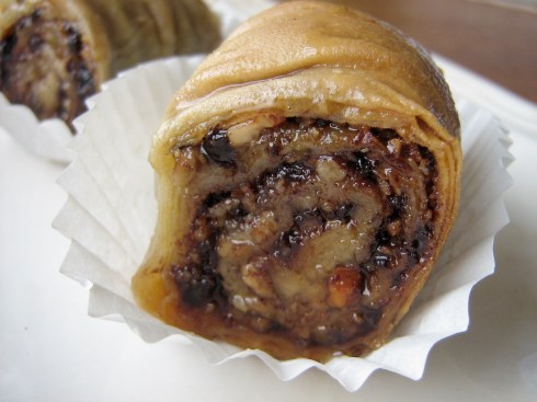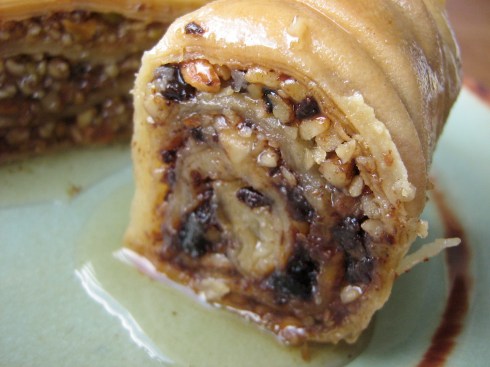 Well, I had four pieces for breakfast the next morning, so I’m gonna say it’s pretty good! 😉 The walnut/almond/pistachio baklava is delicious and better than the baklava I’ve had at Greek restaurants, and the tartness of the cherries and bitterness of the chocolate contrasts well with the sweet syrup in the cherry chocolate baklava. The phyllo dough is surprisingly light and crispy, and the texture of the baklava is really good – it doesn’t shatter into a million little crumbs, but it’s nice and crunchy and flaky. The rolls are slightly denser than the layered baklava, I think because I was a little heavier-handed with the butter, and also I was squishing them into the pan. I will definitely make baklava again with store-bought phyllo, and if I had a pasta maker, I’d give the homemade phyllo another shot… it might be a while before I venture into rolling it out by hand again!!