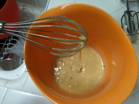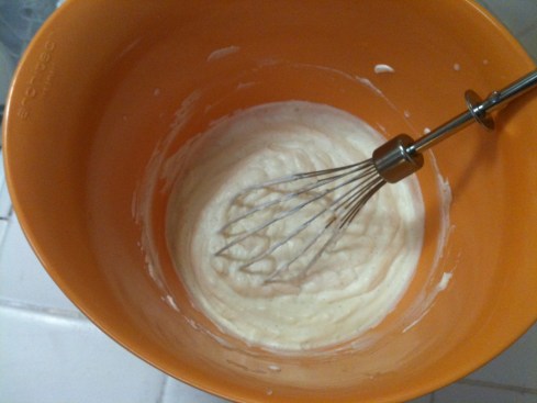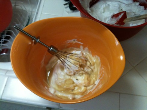 With a spatula, scoop about 1/3 of the egg whites into the cake batter and fold gently to combine (I found it easiest to do this with a whisk).