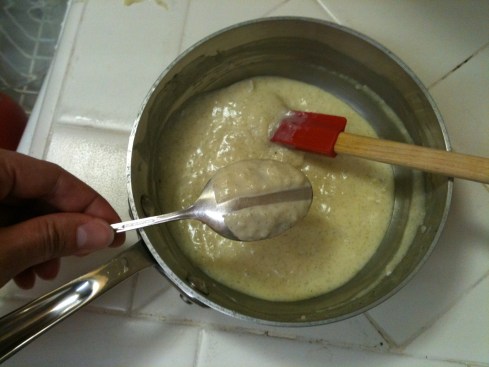 Pour the mixture back into the warm pot and cook over medium heat, stirring, until the custard is thick enough to coat the back of a spoon and is just about to boil (mine got a little overly thick).