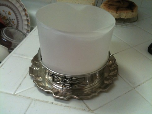 Remove the bottom from an 8″ springform pan and place ring (the pan’s sides) on a serving platter. Line the sides of the pan with plastic wrap – do not line the bottom of the pan. (I used parchment paper to make a collar – next time I would also line it with plastic wrap.)