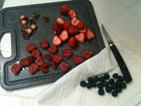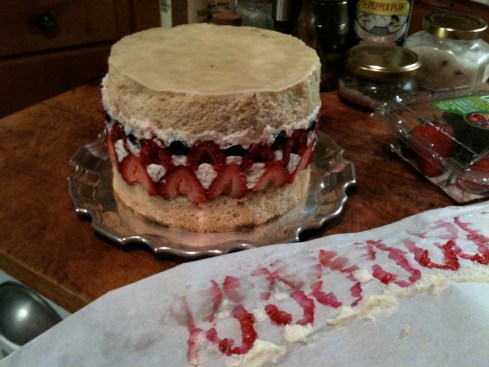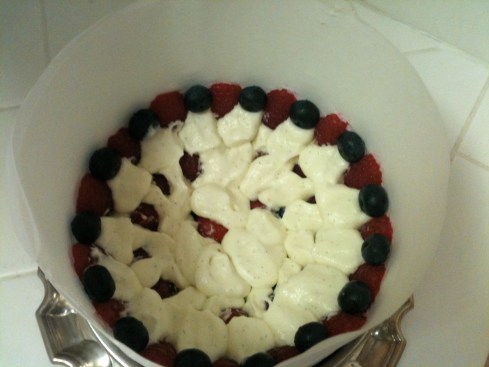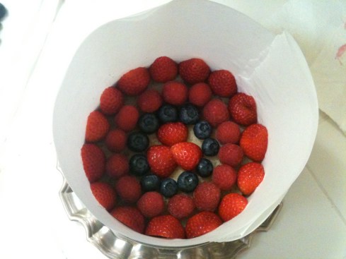 A fraisier is a French pastry consisting of two layers of cake soaked in simple syrup with strawberries and pastry cream sandwiched between. Essentially, it is a free-standing trifle, but the special thing about a fraisier is the exposed fruit around the sides. To make a true fraisier, you have to use strawberries (fraise = strawberry), so I’m not really sure what to call my strawberry-raspberry-blueberry combination – a baies mélanger-ier doesn’t really have the same ring to it. But whatever you want to call it, it was tasty!
