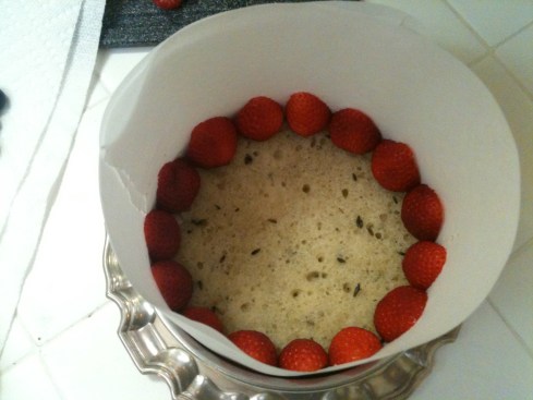 Note: I halved all the recipes to make a 6″ fraisier (I brought my sweet little 6″ springform pan in my luggage!). The normal yield for the recipes below is an 8″ fraisier.