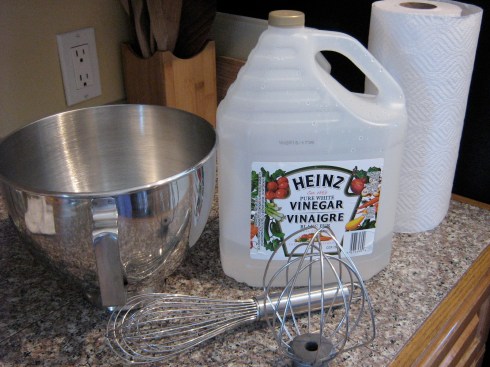 Wipe down the mixer bowl, whisk attachment, balloon whisk, and thermometer with a paper towel moistened with white vinegar or lemon juice to remove all traces of oil – if there is any oily residue, the egg whites won’t whip up properly.